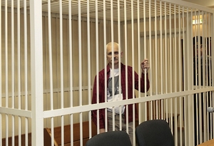 Human rights activist Ales Belyatsky sits in a guarded cage in a courtroom in MinskAles var öflugur í baráttu fyrir mannréttindum og stofnaði mannréttindasamtök sem sættu ofsóknum af hálfu stjórnar Alexander Lukashenko sem komst til valda í Hvíta Rússlandi 1994.