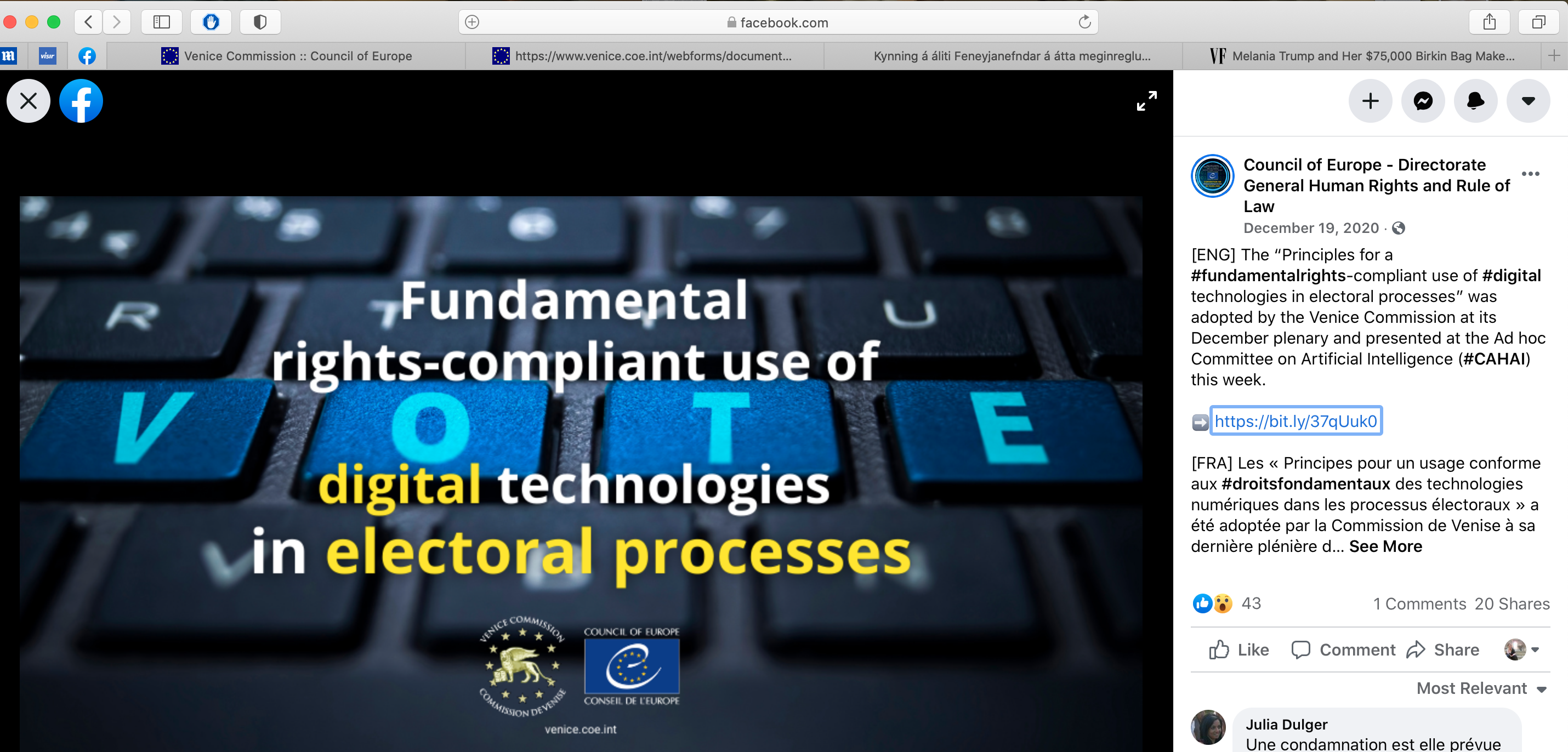 Dagana 11. og 12. desember sl. var aðalfundur Feneyjanefndar haldinn í gegnum netið. Þar kynnti Herdís drög að áliti sem hún er einn af höfundum að um átta meginreglur sem fylgja þarf til að tryggja grundvallar mannréttindaskuldbindingar í aðdraganda kosninga (Principles for a Fundamental Rights Compliante Use of the Digital Technologies in Electoral Processes). Sjá hér.