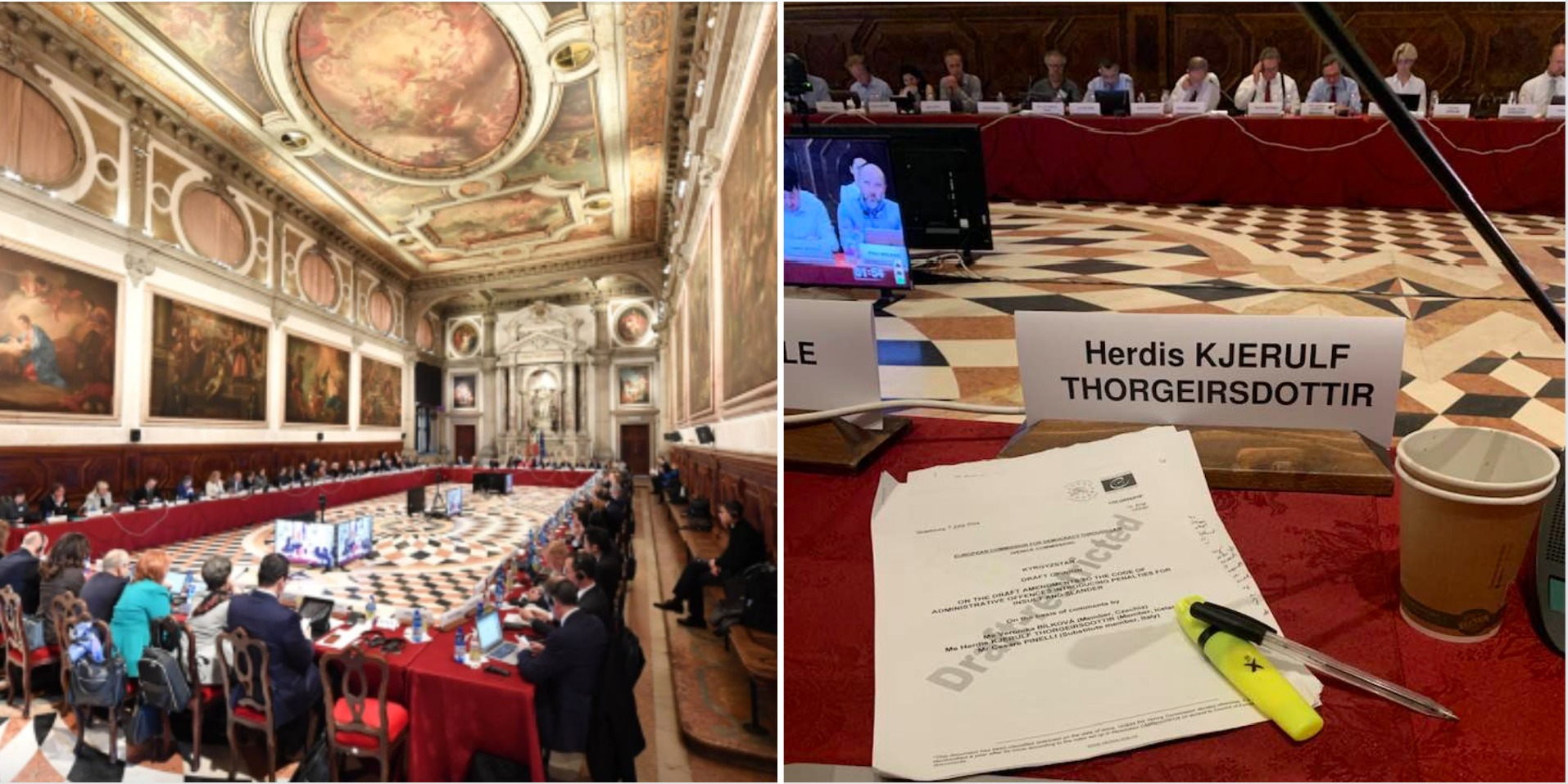 Á síðasta aðalfundi Feneyjanefndar árið 2024 voru samþykkt álit er lutu að Albaníu (Framkvæmd þingsins á ákvörðunum Stjórnlagadómstóls); lagalegar lausnir á framkvæmd kosninga á Haiti; breytingar á stjórnarskrá Póllands varðandi Stjórnlagadómstól; breytingar á lögum varðandi dómara og saksóknara í Serbíu og lög í Tyrklandi um samsetningu dómstólasýslu og saksóknaraembættis og ferli skipunar í þau. Á fundinum var einnig samþykkt uppfærð túlkun á Siðareglum varðandi notkun stafrænnar tækni í kosningum og áhrifum gervigrreindar ásamt greinargerð með skýringum. Herdís Kjerulf Þorgeirsdóttir er einn höfunda þessa plagss en myndin er frá umræðum sem spunnust fyrir samþykkt á fundinum á laugardeginum 5. desember. Aðrar myndir eru einnig frá fundinum. Sjá hér:https://www.venice.coe.int/webforms/documents/default.aspx?pdffile=CDL-AD(2024)044-e