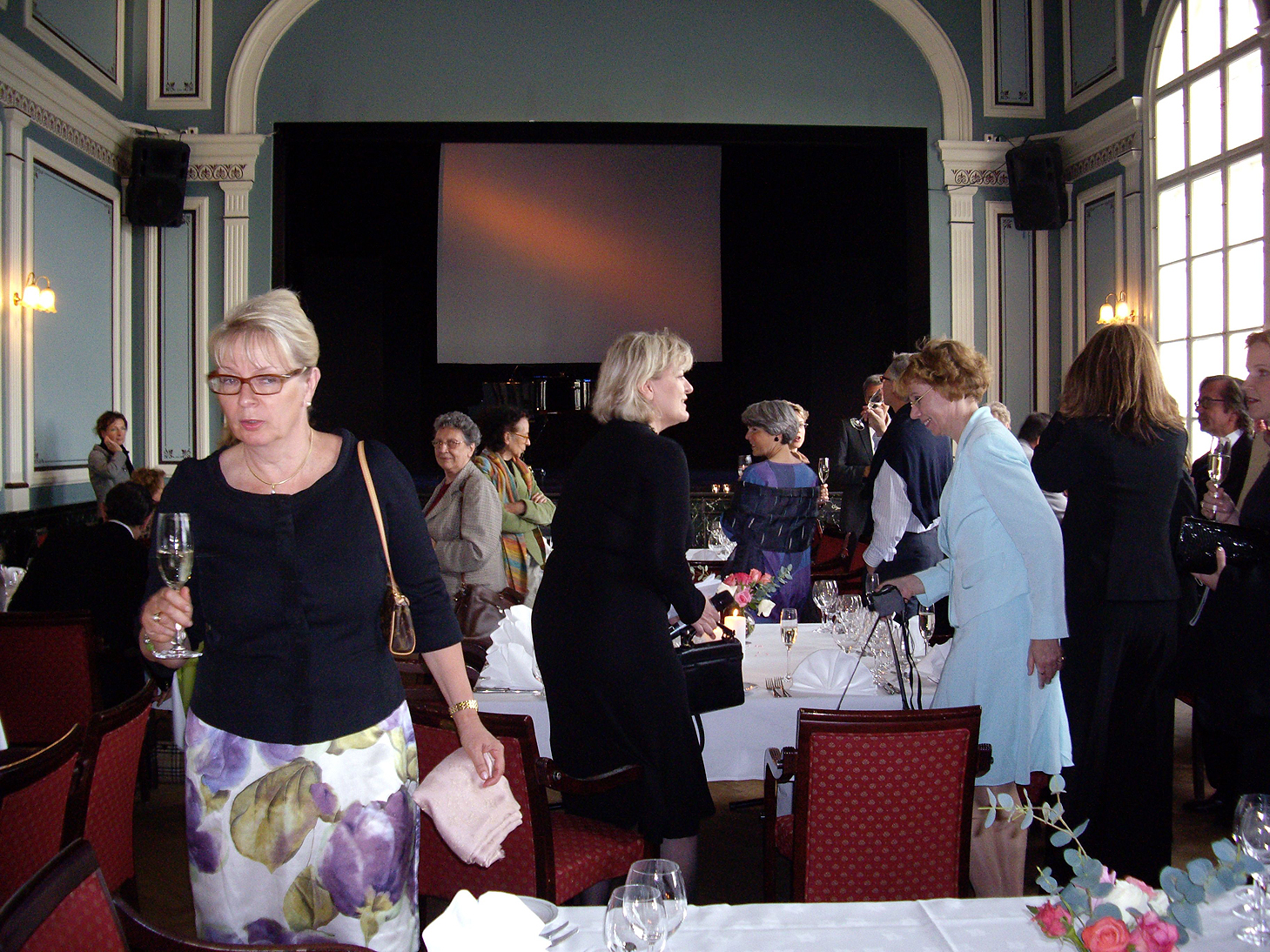Neðri myndin er tekin í kvöldverði í Iðnó. Fyrir miðri mynd er veislustjórinn, Þórunn Hafstein.