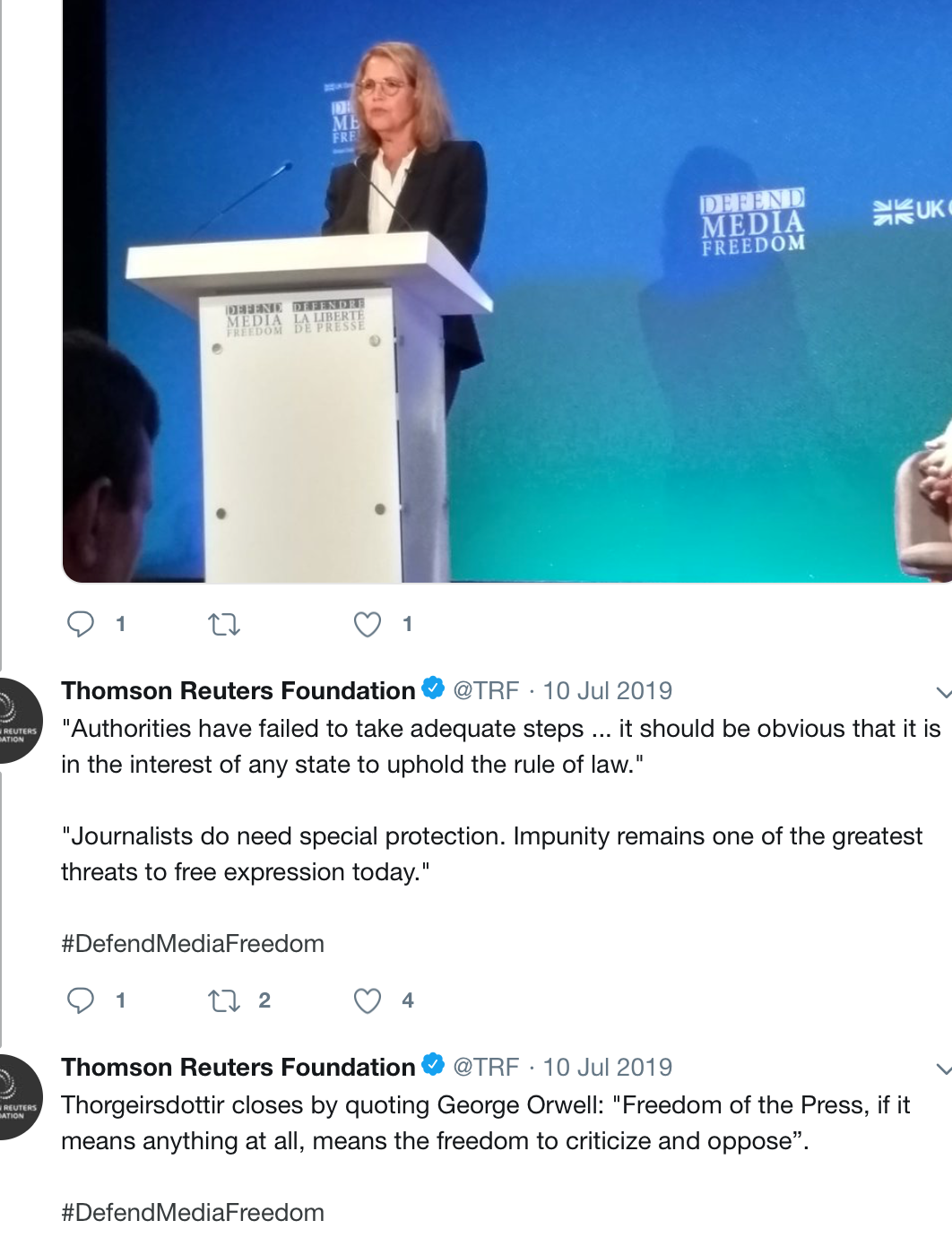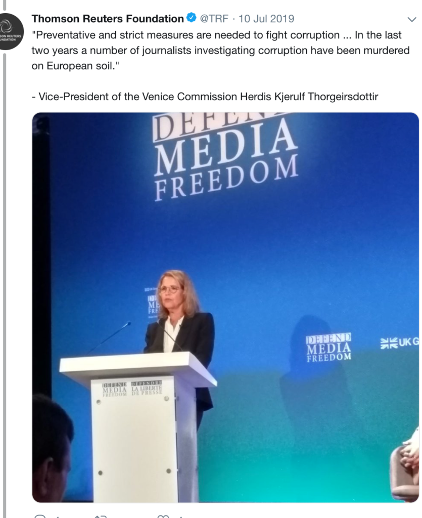 Talaði af hálfu Feneyjanefndar á alþjóðlegri fjölmiðlaráðstefnu í London 10. og 11. júlí sl. Fjallaði um öryggi blaðamanna; réttinn til lífs og tjáningar og sagði frá starfi Feneyjanefndar þ.á m. áliti sem ég og fleiri unnum. Þingmannasamkunda Evrópuráðsins fór þess á leit við Feneyjanefnd í október 2018 að nefndin ynni álit um ástand stjórnskipunar í landinu en fyrirspurnin kom í kjölfar skýrslu á vegum þingsins um hrottalegt morð á blaðakonunni Daphne Caruana Galizia hinn 16. október 2017. Hún hafði verið að rannsaka spillingarmál nátengd stjórnvöldum, þ.á m. peningaþvætti, skattaskjól o.fl. Daphne Caruana Galizia var sprengd í loft upp nokkra metra frá heimili sínu í Valetta, höfuðborg Möltu. Skömmu eftir að beiðnin barst frá Evrópuráðsþinginu kom beiðni frá dómsmálaráðherra Möltu um að Feneyjanefnd skilaði áliti um stjórnskipun á Möltu, sjálfstæði dómstóla og stöðu réttarríkisins í hnotskurn. Rannsókn á morðinu hefur dregist á langinn og stjórnvöld á Möltu sætt harðri gagnrýni. Á undnafjörnum tveimur árum hafa nokkrir blaðamenn sem hafa verið að rannsaka spillingsrmál verið myrtir – í hjarta Evrópu, þ.á m. í Slóvakíku þar sem ungur blaðamaður og kærasta hans voru myrt í ársbyrjun 2018. Fjallaði Herdís um skyldu stjórnvalda til að rannsaka morð af þessu tagi sérstaklega og þ.á m. í ljósi tengsla umfjöllunar blaðamannana og þeirra sem skipulagt hafi morðin því ekki sé nóg að benda á einhverja augljósa “leigumorðingja”.