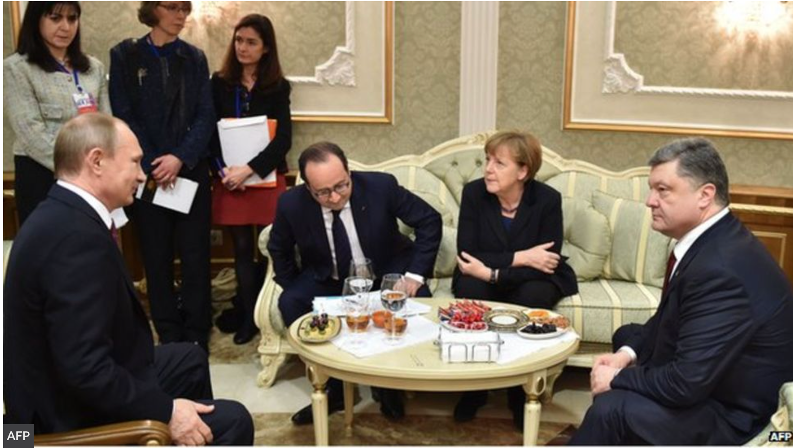 Vladimir Pútin, Francoise Holland þáverandi Frakklandsforseti, Angela Merkel þáverandi kanslari Þýskalands og Petro Poroshenko þáverandi forseti Úkraínu við undiritun Minsk-samkomulagsins.