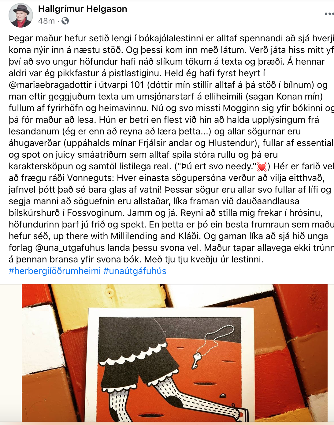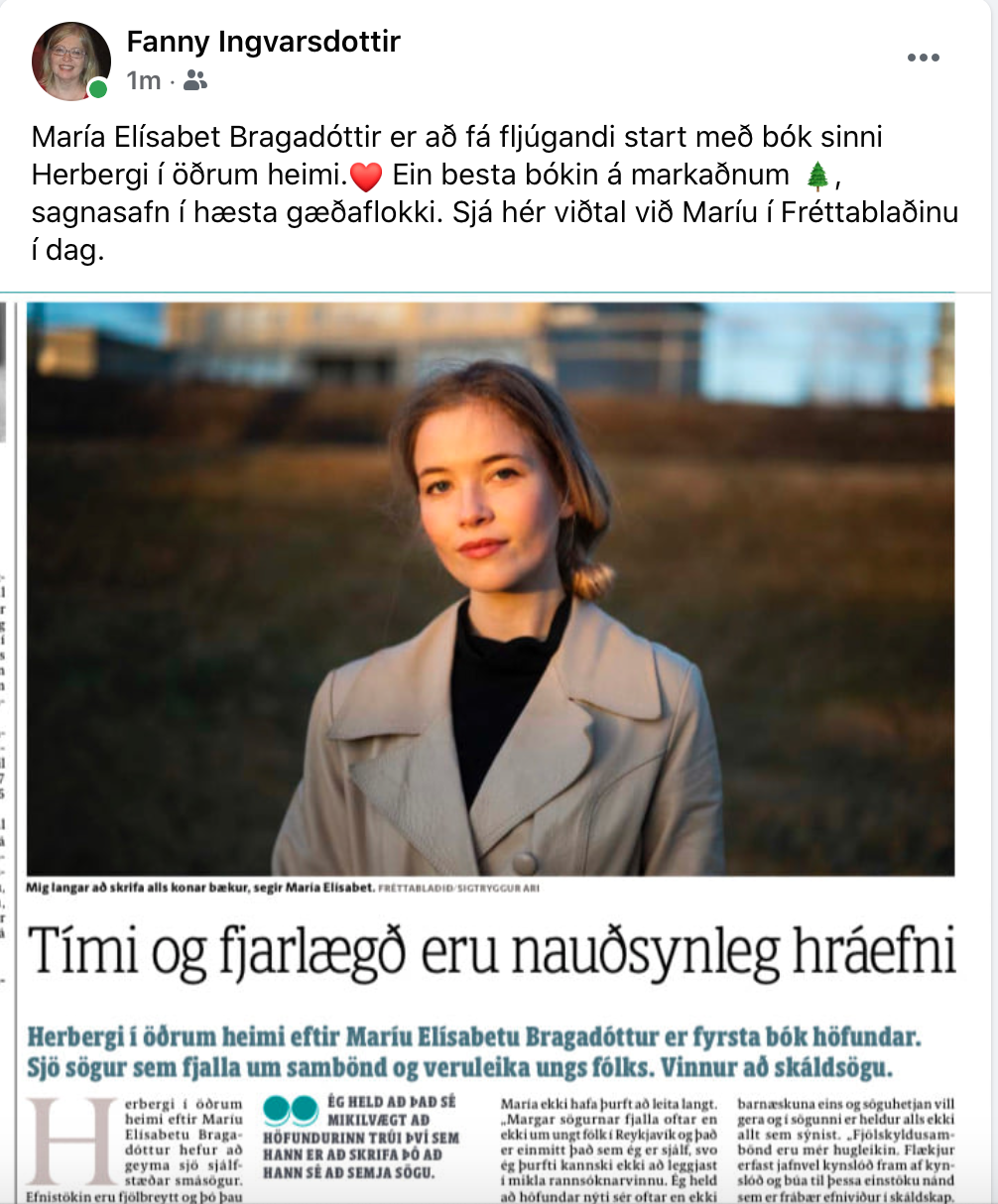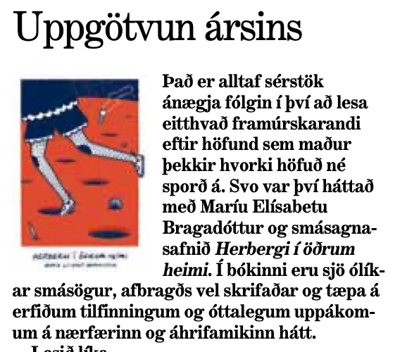 Bók Maríu Elísabetar Bragadóttur, Herbergi í öðrum heim vakti mikla athygli eftir að Una útgáfuhús gaf hana út í byrjun nóvember 2020. Um er að ræða frumraun höfundar og eru þetta 7 smásögur. Gagnrýnandi Morgunblaðsins gaf bókinni fimm stjörnur með þeim ummælum að hver saga væri fullmótuð og höfundi hefði tekist að skapa djúpar og breyskar persónu í hverri sögu; bóksalar völdu bókina aðra bestu bók ársins. Hallgrímur Helgason rithöfundur sagði bók Maríu Elísabetar bestu frumraun sem hann hefði séð. Morgunblaðið kallaði Maríu Elísabetu síðan uppgötvun ársins í úttekt á bókum sem út komu árið 2020.
